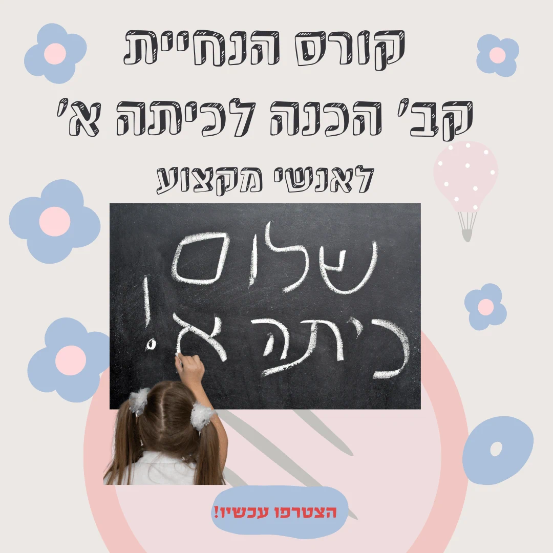 - בואי ללמוד באופן המקיף, המקצועי והפרקטי ביותר, כיצד להיות מנחת קב' הכנה לכיתה א' מקצועית ומבוקשת ולהרחיב באופן משמעותי את אפשרויות התעסוקה שלך והסיפוק מהעבודה!